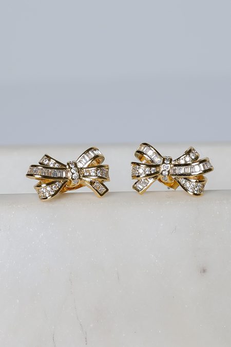 The Madison Gold Rhinestone Bow Earrings have effortless drama and everyday styling power! These trendy earrings are designed with a bow shape with rhinestones + stud post back. Add these cute earrings to a black dress + heels to add a girly touch to your date night look! Gold Plated…
