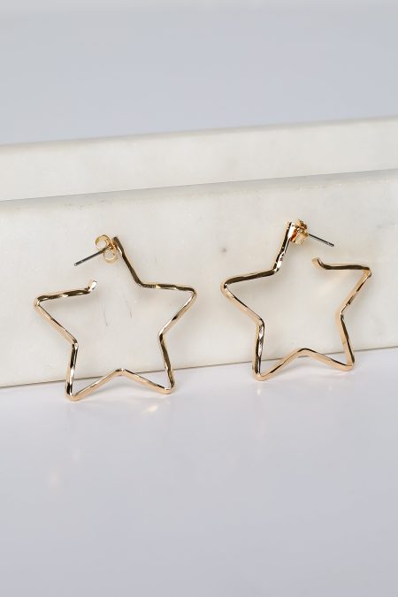 The Missy Gold Star Hoop Earrings are sure to inspire! These dainty earrings feature a star-shaped hoop design with a lever back! Style the Missy Earrings with a mini dress + heels for a trendy look! Gold Plated Star Shape Hoop Lever BackOne Size | Length 1.25”